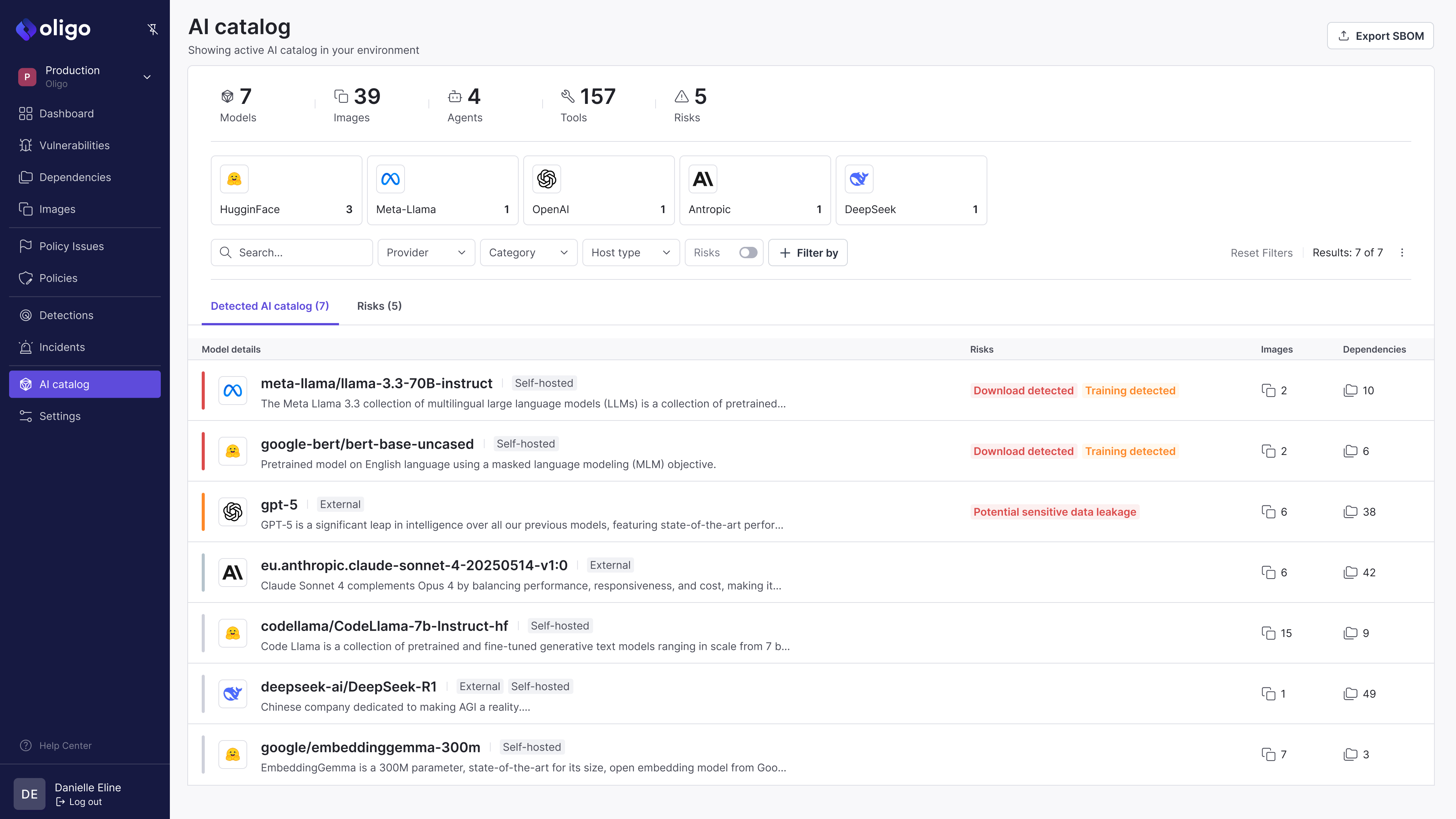 Developers are adopting GenAI at a rapid pace, making it hard to security teams to keep pace. Oligo identifieis which GenAI models are used at any given time, generating an AI Bill of Materials (AI-BOM) that details security and legal risks at any point in time.