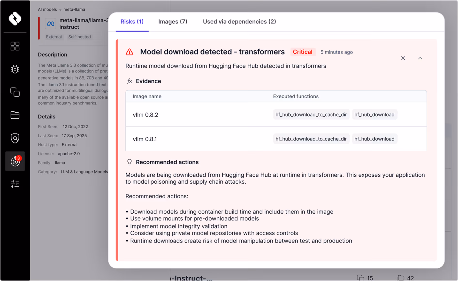 Detect misconfigured, unsafe, untrusted, and vulnerable AI models that can lead to code injection and other risks. Protect the AI supply chain where it matters most: your running applications.