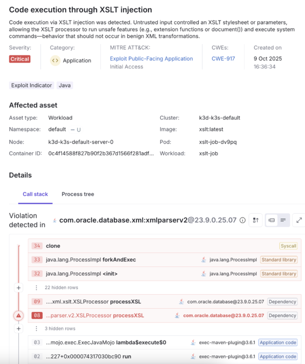 For example, Oligo CADR detects XSLT injection techniques used to achieve remote code execution in Oracle EBS BI Publisher. The detection is payload-agnostic and focuses on the exploitation technique itself, generalizing to future variants even as payloads evolve.