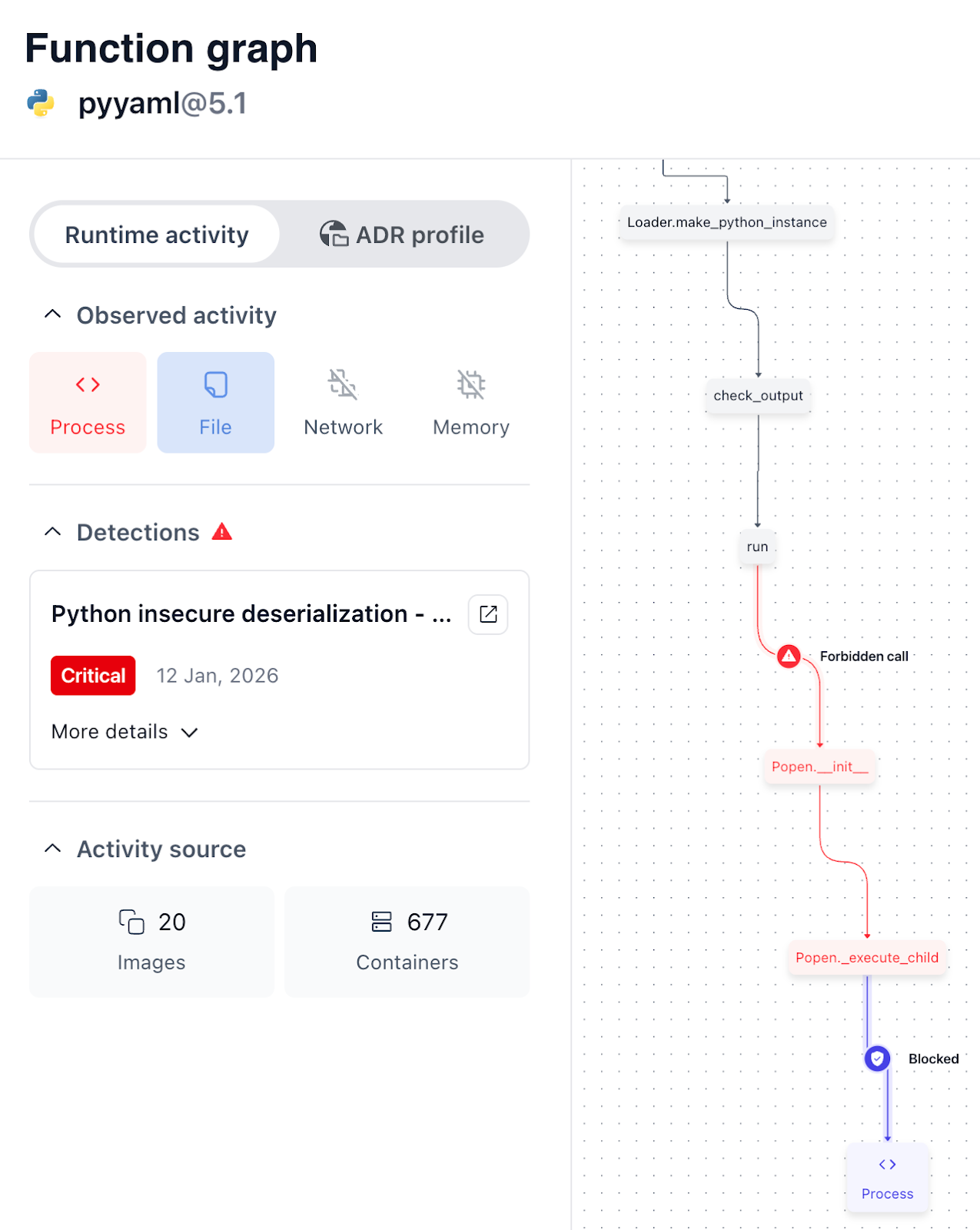- Observe unsafe deserialization behavior in real time, detecting when PyYAML is invoked with unsafe loaders during document parsing flows, regardless of whether PyYAML is a direct or transitive dependency.